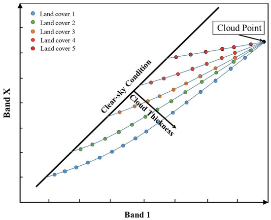 The impact of increasing cloud optical depth on the reflectance of a given land cover can be characterized by a ‘cloud trajectory’ in spectral space [19]. Both the additive radiometric effect and energy attenuation effect of clouds can be characterized by the cloud trajectory as a relationship between cloud thickness and TOA reflectance, as shown in Figure 3. Therefore, the basic concept of cloud removal is to fit each unique cloud trajectory for each clouded pixel and migrate it back along the trajectory to the clear sky condition. This cloud trajectory fitting involves two steps. First, the general direction of the cloud trajectory is captured by setting the cloud point [19] as the end of the trajectory. To ensure the accuracy of the cloud trajectory, the second step searches for a series of similar clouded pixels with cloud thinner than that of the target pixel. By combining the cloud point and a series of similar clouded pixels, the cloud trajectory is constructed and can be applied for cloud removal.