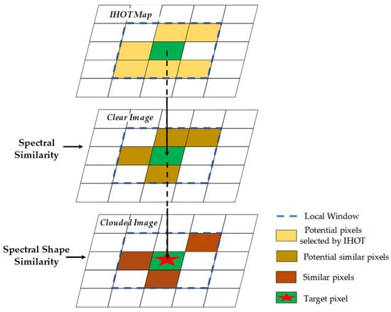 To ensure the accuracy of the cloud trajectory fitting, the second step searches for a series of similar pixels with different cloud thicknesses. The similar pixels share the similar land surface reflectance and their TOA reflectance vary with only cloud thickness. In this search process, two types of pixels should be excluded: (1) the cloud shadows, as described in Section 2.2 and (2) the clouds thicker than that of the target pixel, as they contain less land cover information. Therefore, the search for similar clouded pixels is focused on the pixels with clouds thinner than that of the target pixel. The search range is a local window centered at the target pixel; and the search radius increases until qualified similar pixels are identified. The criterion is that at least one similar pixel should be found for each IHOT bin with an interval of 0.01. This is to ensure that the searched similar pixels are able to be as evenly distributed along with cloud trajectories, which assists in stabilizing the linear fitting of cloud trajectory. The two similarity measurements, namely, the spectral similarity and the spectral shape similarity, are applied to identify similar pixels. The illustration of such a process is shown in Figure 4. Since the spectra of blurry pixels in the clouded image may be confounded by the land surface [15], it is not practical to apply the spectral similarity directly to the clouded image. Thus, the secondary clear image of the corresponding region is used to search for similar pixels. Although images acquired at different times usually have some changes under different atmospheric or seasonal conditions, the relative positions of similar pixels generally are coincident in different seasons [14]. Thus, the spectral similarity of the correlation coefficient r of the clear image is calculated by Equation (2).