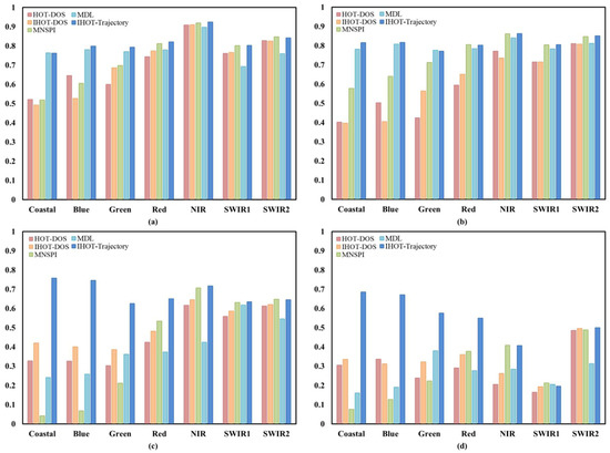 Correlation coefficients (r) between the reference image and the restored image using haze optimized transformation-dark object subtraction (HOT-DOS), iterative haze-optimized transformation-DOS (IHOT-DOS), IHOT removal of cloud trajectory (IHOT-Trajectory), modified neighborhood similar pixel interpolator (MNSPI) and multitemporal dictionary learning (MDL). (a–d) correspond to r of Figure 5b,c and Figure 6b,c, respectively.