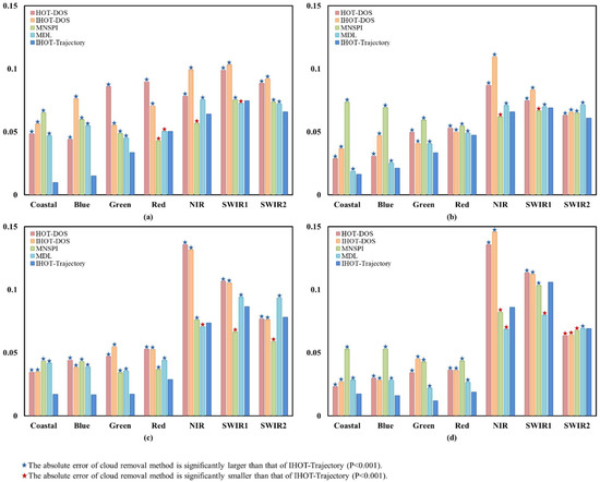 The results indicated the IHOT-Trajectory was able to overcome large phenological differences between the secondary clear image and the clouded images. In contrast, the DOS-based methods performed worst in most land covers. Because there always exist thick clouds, DOS-based methods quickly become ineffective in all spectral bands from visible to shortwave infrared (SWIR). The MNSPI method also performed quite poorly in complex cloud-contamination areas because of a strict requirement for clear similar pixels. Although MDL had a better performance than MNSPI and DOS in Figure 5, it showed considerable flaws in Figure 6. Possibly, large phenological differences between the secondary and clouded images influenced the accuracy of multi-dictionary learning. In summary, the IHOT-Trajectory method has the best performance in most spectral bands except for infrared bands. The least improvement in the infrared bands might be explained by two reasons. First, the atmospheric effect is relatively weak in the SWIR bands. Second, there are stronger non-linear effects in the relationship between IHOT and TOA reflectance in the SWIR bands.
