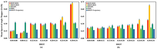 In order to further investigate the relationship between the cloud removal error and the cloud thickness, mean SAM values were calculated under different IHOT bins. As shown in Figure 9, the proposed method performed quite robustly and possessed high accuracy and stability as the IHOT value increased. It indicates that there is no obvious difference between the cloud removal errors on thick and thin clouds, although the removal of thick cloud is particularly treated with Equation (8) that is slightly different from Equation (6) used for the removal of relatively thin clouds. In contrast, the performance of the HOT-DOS and IHOT-DOS methods became increasingly worse as the cloud thickness increased because DOS methods require a transparent signal for cloud correction. For MNSPI and MDL, both of them also have stable performances as cloud thickness increases whereas their mean SAM values continuously maintain higher values.