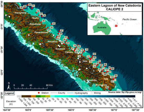 Map of the study area indicating the location of the sampling stations from the CALIOPE 2 conducted from 8 to 21 of March 2014 in the Eastern Lagoon of New Caledonia (ELNC). Data from bathymetry, hydrography, villages, and mining sites were downloaded from ftp://ftp.gouv.nc/sig/ accessed on 5 February 2014.