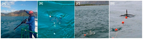 Radiometric data was collected using two types of in-water radiometers: (i) the free-falling Satlantic profiler and (ii) TriOS sensors, attached to a floating structure (Figure 2C,D), for comparison and uncertainty determination. The Satlantic free-falling profiler radiometer (Hyperpro-II) (Figure 2A,B) measures radiance between 350 and 800 nm (3.3 nm bandwidth). With this instrument radiometric data was obtained at 40 stations with in-water profiles of downwelling irradiance (Ed(λ,z)) and upwelling radiance (Lu(λ,z)). Data was pre-processed using the Prosoft software with the instrument calibration files, and some profile editions to eliminate noise (using tilt and velocity thresholds). To make the profiles even smoother, filtering out noise caused by wavy facets and bubble clouds, a second order polynomial fit was also applied to each profile. To extrapolate Ed(λ,z) and Lu(λ,z) to just below surface values (0−), the diffuse light attenuation coefficients (Kd(λ) and Ku(λ), respectively) were determined using the intercept of the linear regression fit of the log transformed data (assuming an homogeneous profile). The depth interval used to determine Kd and Ku varied at each station from 5–15 m, depending on the size of the profile and avoiding noisy intervals. After the extrapolation of Lu(λ) and Ed(λ) to 0−, they were extrapolated to just above surface (0+), i.e., Lw and Ed(0+), using air-water transmittance factors [61]. The Rrs determined with the Satlantic free-falling profiler (RrsS) was finally obtained by the ratio of Lw/Ed(0+).