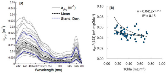 Phytoplankton absorption (aphy) spectra (A) and specific phytoplankton absorption coefficient (aphy*) at 443 nm versus the TChla, with the power law regression fit (solid line) and the Bricaud et al. [23] fit for reference (dashed line) (B) (Number of samples = 52).