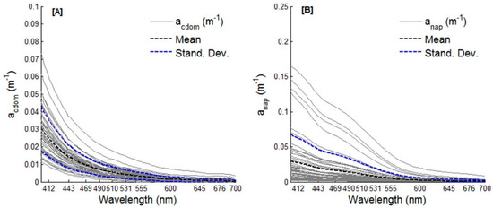 Coloured dissolved organic matter (CDOM) absorption (acdom) spectra (A) and non-algal particles (NAP) absorption (anap) spectra for each station, mean and standard deviation for all stations (B) (Number of samples = 52).