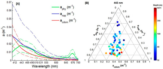 Mean (solid lines) and standard deviation (dashed lines) of phytoplankton absorption (aphy), Coloured dissolved organic matter (CDOM) absorption (acdom) and non-algal particles (NAP) absorption (anap) (A). Ternary diagram with the proportions of aphy(443), acdom(443) and anap(443) for each station (Number of samples = 51) colour coded by the bottom depth (m) (B).