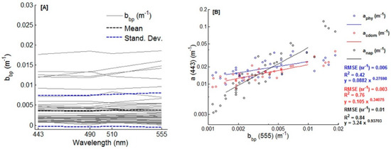 Particulate backscattering coefficient (bbp) spectra for each station, mean and standard deviation (Number of samples = 52) (A). The bbp at 555 nm versus phytoplankton absorption (aphy) at 443 nm, Coloured dissolved organic matter (CDOM) absorption (acdom) at 443 nm and non-algal particles (NAP) absorption (anap) at 443 nm with their mean square error, coefficient of determination (R2) and the power law fit for the 51 stations sampled in ELNC (B) (axes in log10).