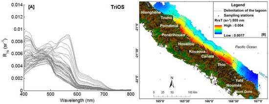 The Rrs spectra characteristic of clear waters with higher values at shorter wavelengths (<490 nm), were obtained at the deepest stations across the coral reef barrier, and at the southern and northern tips of the lagoon, where oceanic waters have greater intrusions. Near the main rivers, and especially close to the mining sites (between Thio and Ponérihouen), the Rrs spectra were characteristic of water types dominated by biogenic constituents, that absorb more light in the blue wavelengths, resulting in lower Rrs (<490 nm), and mineral particles that are highly scattering and contribute to higher Rrs at longer wavelengths (>500 nm) (Figure 8).