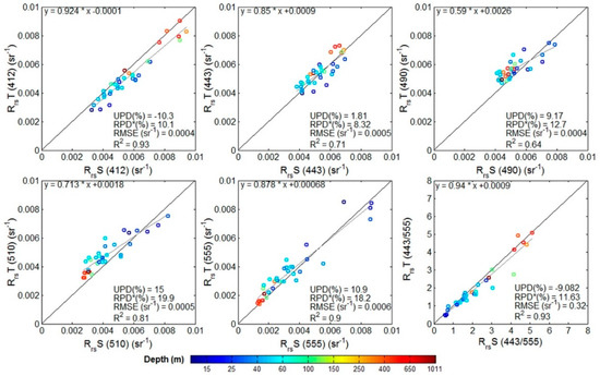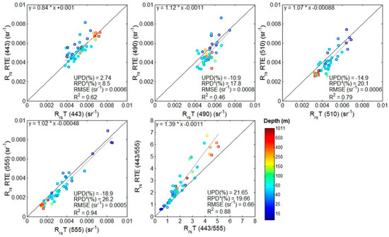 Comparison of the modelled Remote sensing reflectance (Rrs) of the radiative-transfer equation (RTE) following Park and Ruddick [66] and measured Remote sensing reflectance from TriOS radiometer (RrsT) for each band and for the 443:555 band ratio (Number of samples = 48).