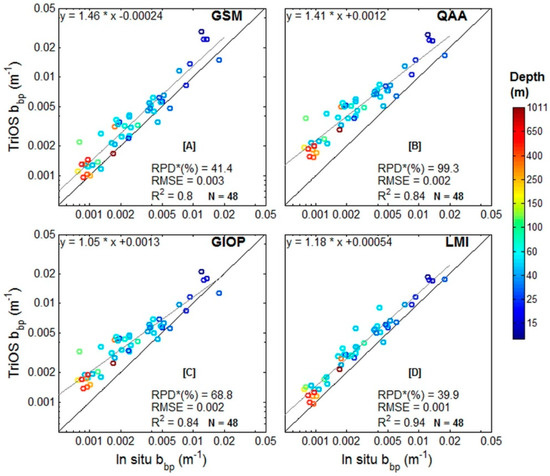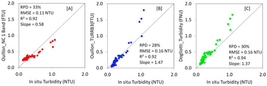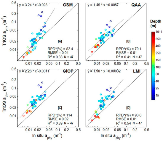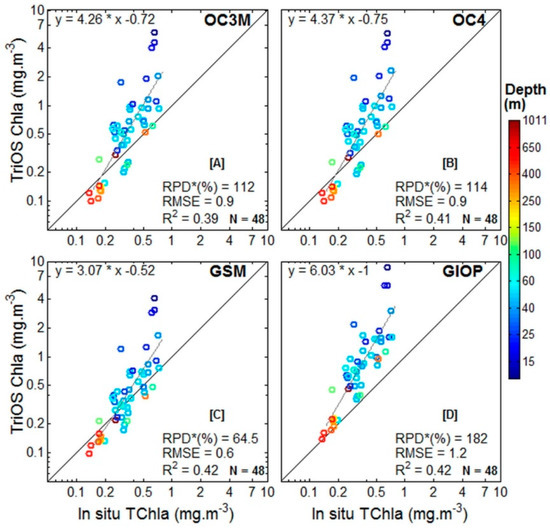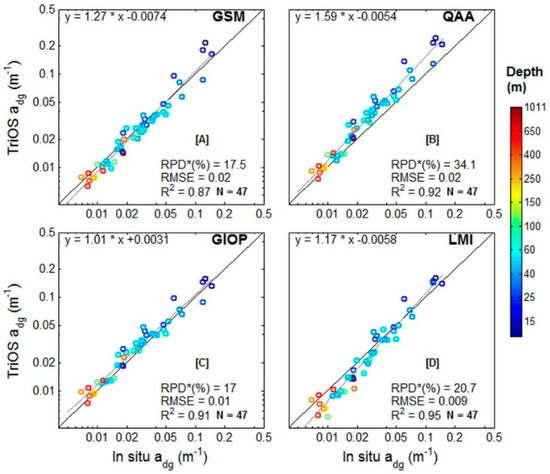 All the retrievals were compared to the in situ measurements using statistical metrics of linear regression: the slope, R2 and RMSE, and the relative mean percent difference (RPD).