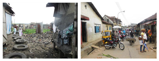 According to [50], there are two types of deprived urban areas in Nigeria: squatters and slums. Squatters are uncontrolled or temporary dwellings inhabited by migrants from within and outside the city, while slums are old residential areas built long ago, in line with the then-prevailing urban planning, zoning, and construction standards, but now dilapidated and overcrowded. The research conducted by [51] shows that Lagos has the two identified deprived areas (Figure 3). Further, the Lagos state government sometimes include squatters under the category of slums, due to their similar physical characteristics, as observed in the Lagos Metropolitan Development and Governance Project (2006), where water, road, and electricity were provided to nine blighted communities (Agege, Ajegunle, Amukoko, Badia, Iwaya, Makoko, Ilaje, Bariga, Ijeshatedo/Itire), without considering if it was a squatter or slum. In this study, squatters and slums were equally considered to prevent bias as they all need to be monitored and improved.
