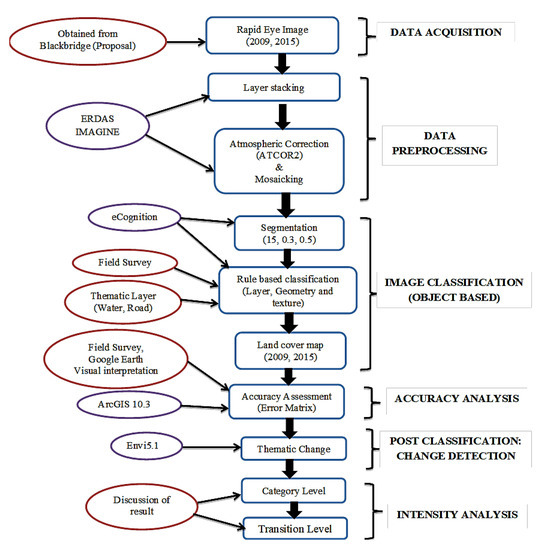 Change detection from satellite imageries could be from pre-classification or post-classification. This study utilized the post-classification techniques to detect changes in the land use maps developed from the satellite imageries acquired at different dates. This technique includes: data pre-processing, image classification, accuracy assessment, and change detection [35]. The post classification is widely utilized because it provides a matrix of land transition among different categories [32], which serves as the input data for the intensity analysis. The thematic change workflow in the ENVI software package [52] was utilized to detect spatial changes in the extent of slums and other identified LULC in the maps produced for 2009 and 2015.