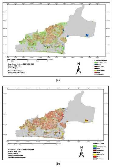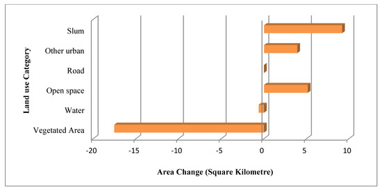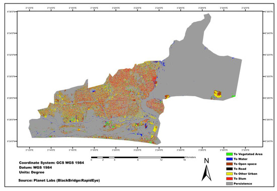 Figure 6 presents a map showing the detected changes in the land use pattern in the study area during the time interval studied. The map gives information on the final state of the use of the land area. Transitions in all land use categories were observed during this time interval. Changes were observed in the proportion of areas covered by each land categories, except water, though small changes may have occurred. Furthermore, the area of change increased for slum, open space, roads, and other urban areas, while it decreased for vegetated areas. Although the proportion of the land area occupied by slums (Figure 5a,b) was smaller than other land use categories, its total net gain was higher compared to the others (Figure 7).