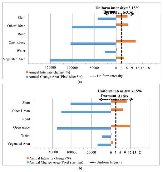 Since slums have distinctive spatial characteristics [19], intensity analysis can help to understand the underlying processes leading to their observed growth pattern. Intensity analysis compares the predicted annual uniform rate of change, the rate that will exist if the annual changes were distributed uniformly across the entire time extent, against the observed annual rate of change among categories [39]. The intensity analysis is based on the availability of maps of different time periods for the same sites containing the same land use categories. The application and limitations of intensity analysis have been discussed in several studies (see [35,38,39,40,41]).