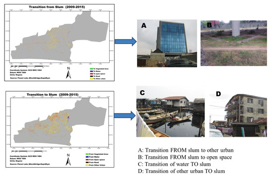 The transition from other urban to a slum is a type of building which has been poorly maintained (Figure 10). This study focused on the older section of Lagos where the colonial style of houses were still common. Most of the colonial style of housing in Lagos is difficult to maintain because of inadequate technical knowhow and unavailability of foreign materials, leading to their poor maintenance [71]. In addition, poor maintenance of existing buildings in the study area is attributed to the poverty level in the city. Approximately 66.9% of Lagos residents’ live below the poverty line [72] and, according to [73], poverty is a cause of environmental stress in Lagos. Many house owners lack the required financial resources to maintain/improve their homes.