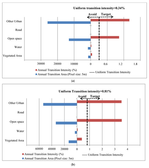The interaction between humans and the biophysical environment has been pointed out as the main driver of land use and land cover changes [31,32,33], nevertheless, it is important to link the patterns of land use and land cover changes (LULCC) with their underlying processes, and bridging the gap between social science and remote sensing [34]. Further, quantification of land use and land cover changes (LULCC) entails computation of a land cover/use transition matrix. However, this matrix does not provide sufficient information on the quantitative and systematic signals of land use and land cover changes [35]. In many cases, the transition matrix is analyzed at a broad level and may fail to reveal the total change on the landscape; for instance, zero net change due to simultaneous gain and loss within the landscape [36]. Additionally, discriminating significant signals during land use shifts is important in LULCC [37] and it is difficult to establish from a transition matrix. Purposefully, Aldwaik, S.Z., et al. [38] developed the intensity analysis, a type of change detection, to quantitatively analyze changes in different land use categories from time to time for a single site, by utilizing cross-tabulation matrices to summarize changes for each time interval. Although intensity analysis is sensitive to domain selection and the size of land use categories [39], it has been successfully utilized to integrate patterns with processes of land use and land cover changes [33,40,41].