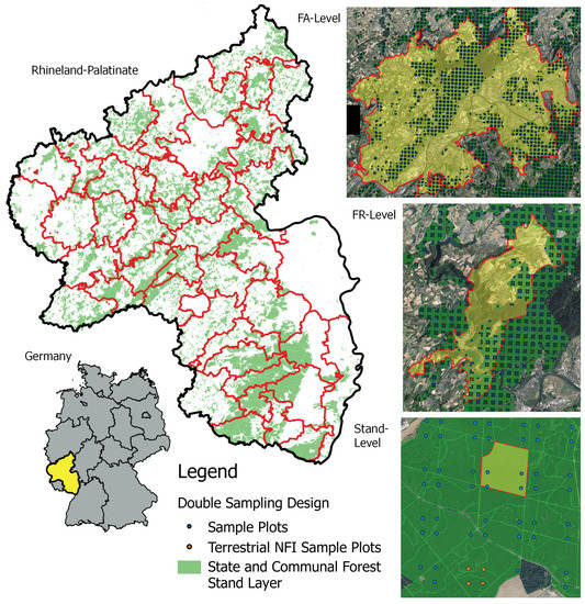 The German federal state Rhineland-Palatinate (RLP) is located in the western part of Germany and borders Luxembourg, France and Belgium. With 42.3% (appr. 8400 km) of the entire state area (19,850 km) covered by forest, RLP is one of the two states with the highest forest coverage among all federal states of Germany [2]. The forests of RLP are further characterised by a pronounced diversity in bioclimatic growing conditions that have strong influence on the local growth dynamics as well as tree species composition [38] and are further characterised by large variety of forest structures ranging from characteristic oak coppices (Moselle valley), pure spruce, beech and scots pine forests (i.a. Hunsrück and Palatinate forest) up to mixed forests comprising variable proportions of oak, larch, spruce, Scots pine and beech. Around 82% of the forest area in RLP are mixed forest stands and 69% of the forest area exhibit a multi-layered vertical structure. The forest area of RLP are divided into 3 ownership classes, i.e., state forest (27%), municipal forest (46%) and privately owned forest (27%). The forest service of RLP has the legal mandate to sustainably manage the state and municipal forest area (73% of the entire forest area), including forest planning, harvesting and the sale of wood [39]. For this reason, the entire forest area has been spatially organised in 3 main hierarchical management units (Figure 1). On the upper level, RLP has been divided into 45 forest districts (Forstämter, FA), which are further divided into a total number of 405 sub-districts (Forstreviere, FR). The next level are the forest stands (104,184 in total) for which expert judgements are conducted by SFIs in a 5 to 10 year period in order to set up management strategies for the upcoming 10 years. The FAs and FRs constituted the SA units for which design-based small area estimations of the mean standing timber volume were calculated by incorporating the available terrestrial inventory data of the BWI3 in the estimators described in Section 4. The average area of the SA units was 43,777 ha on the FA-level, and 4624 ha on the FR level.