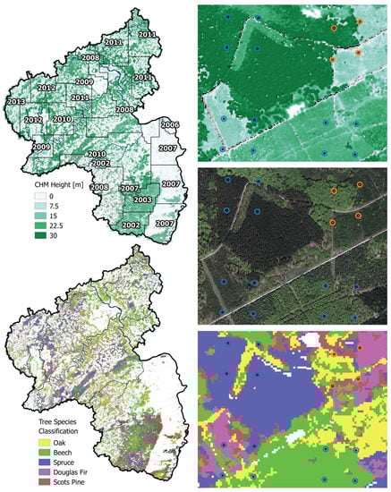 - Hill, A.; Buddenbaum, H.; Mandallaz, D. Combining canopy height and tree species map information for large-scale timber volume estimations under strong heterogeneity of auxiliary data and variable sample plot sizes. Eur. J. For. Res. 2018. [Google Scholar] [CrossRef]
