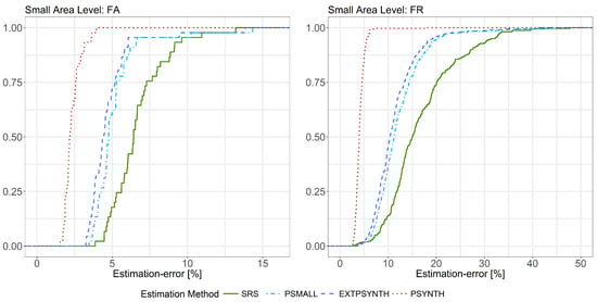 On both small area levels, the design-unbiased estimators PSMALL and EXTPSYNTH led to a substantial reduction in the estimation error compared to the SRS estimator (Figure 3). On the FA level, the SRS estimator yielded an estimation error of 6.7% on average compared to 5.2% and 4.8% under EXTPSYNTH and PSMALL respectively (Table 6). The cumulative error distribution (Figure 3, left) reveals that under the SRS estimator, errors less than 5% were achieved for 17% of the FA units (8 of 45). This proportion could be increased to 62% (28 FA units) and 73% (33 FA units) by application of the PSMALL and EXTPSYNTH estimator. 95% of all estimates exhibited errors less than 9.5% under the SRS estimator and less than 6.6% when using PSMALL or EXTPSYNTH. Estimation errors higher than 10% only appeared twice for each of the three estimators.