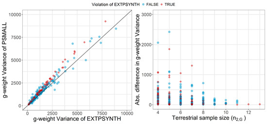 Figure 3 reveals that the error distribution of PSMALL and EXTPSYNTH are very similar, with PSMALL showing marginally higher estimation errors. In order to investigate the differences between PSMALL and EXTPSYNTH, we compared the g-weight variances of both estimators for all 321 FR units (Figure 4, left). As obvious, PSMALL yielded slightly larger variances for the vast majority of the estimates. As addressed in Section 4.2.3, one possible explanation for differences was the effect of one or more clusters not entirely being included in a small area unit, as this would constitute an assumption violation of the EXTPSYNTH estimator. This violation was actually observed in 155 of the 321 FR units (48%). We compared the variances of PSMALL and EXTPSYNTH for all small areas that did not have the violations using a Wilcoxon Signed-Rank Test [48] on a 5% significance level. This test was also performed pairwise for groups , and . The distribution of variances from EXTPSYNTH was found to be highly significantly lower than that of PSMALL except for the group of . The latter was expected since the variances of both estimators are asymptotically equivalent under large terrestrial sample sizes within the small area [35] (pp. 17–18). This was also confirmed by a visual comparison of the absolute differences in the variances (Figure 4, right) which decreased with increasing terrestrial sample size. Performing the same comparison for small areas with violations also revealed the EXTPSYNTH variances to be significantly smaller than the respective PSMALL variances until sample sizes . Based on these investigations, it was not possible to determine whether the differences for sample sizes smaller than 10 were caused by the violations or just reflect the general tendency of EXTPSYNTH to produce smaller variances than PSMALL under small sample sizes. However, a visual inspection provided some evidence that the violations created a statistically significant influence on the EXTPSYNTH variance (Figure 4, left, red diamonds) that makes it appear to be slightly over-optimistic. For sample sizes of , a weakly significant difference between the EXTPSYNTH variances of those small areas with violations and the EXTPSYNTH variances without violation was also indicated by an unpaired Wilcoxon Rank-Sum Test. However, the differences were still marginal and a comparison of the confidence intervals of PSMALL and EXTPSYNTH revealed that the variance differences did not lead to statistically significant point estimates.