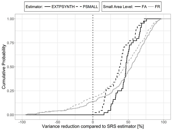 The variance reduction relative to SRS for PSMALL and EXTPSYNTH are described in Figure 5 and Table 7. A direct comparison of the variances within the small area units revealed that the application of the design-unbiased estimators (PSMALL, EXTPSYNTH) led to a variance reduction compared to SRS in all FA units. In 75% of the FA units, the EXTPSYNTH estimator was able to reduce the variance by up to 54.1%. The reduction in variance can also be expressed in the relative efficiency values, which were 2.02 on average and ranged between 1.18 and 4.13 on the FA level. On FR level, the reduction in variance even reached values of 90% and relative efficiencies of 30 (Table 7 and Figure 5). The PSMALL estimator again yielded slightly lower variance reductions and relative efficiencies due to the generally smaller variances of the EXTPSYNTH estimator (Section 6.3).