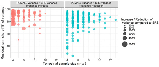 Cases also occurred on the FR level where one or both two-phase estimators produced larger variance values than under the SRS estimator. This happened in 19% of the FR units under the EXTPSYNTH, and in 24% of the FR units under the PSMALL estimator. One possible reason for this was supposed to be a large residual variance due to a poor performance of the regression model within the small area unit. In order to investigate this hypothesis, we analyzed the three variance terms of the PSMALL estimator (Equation (14b)), i.e., the variance introduced by the uncertainty of the regression coefficients (term 1), the variance caused by estimating the auxiliary means (term 2), and the variance of the model residuals (term 3). In general, the residual term is expected to make the largest contribution to the overall variance since it’s sample size is based on whereas the auxiliary term and the coefficient term are based on larger sample sizes, i.e., and respectively. Figure 6 illustrates the share of the overall variance by the residual term of the PSMALL estimator scaled by the overall percentage reduction or increase of the variance compared to SRS for various small area sample sizes . Not surprisingly, the residual term generally constitutes the dominating part of the PSMALL variance (around 84% on average). It has to be noted that such high residual term dominance does not necessary indicate that the PSMALL variance will be disproportionately large (Figure 6, right). However, the vast majority of cases where the PSMALL variance was considerably larger than the SRS variance occurred where the residual term contributed over 75% to the overall PSMALL variance (Figure 6, left). Among those cases, the most pronounced were observed under small sample sizes . Here, the average increase in variance compared to SRS of those FR units with was 272%, compared to 62% for FR units with . In contrast, the decreases in variance compared to SRS (Figure 6, right) were much more homogeneous in magnitude and also independent of the terrestrial sample size. Since is the same for PSMALL and SRS, these observations imply that in the problematic small areas, the sum of square residuals for the regression model are likely larger than the sum of square local densities for the clusters in . This indicates the presence of outliers with large residuals, which likely arise when there was forest loss after the ALS scanning but before the terrestrial survey year.