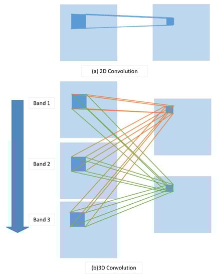 A 1D CNN extracts spectral features, whereas a 2D CNN extracts local spatial features of pixels. However, HSIs contain both abundant spatial and spectral information. For HSI classification, this means to the use of a 3D CNN, which can extract both types of information. As shown in Figure 1a, the 2D convolution sends a channel of the input image to another feature map after a convolution kernel operation. For an input image with three channels of spectral information (Band1, Band2, and Band3), a 3D convolution processes the data from three channels using two convolution kernels to obtain two characteristic maps, as shown in Figure 1b. Within the neural network, the value at position on the feature cube in the layer can be formulated as follows []: