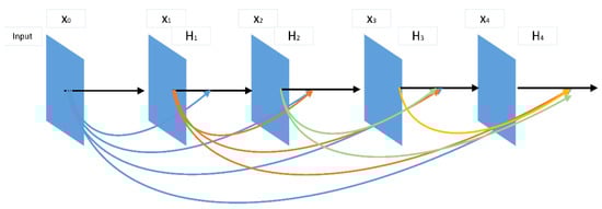 As shown in Figure 2, DenseNet [] uses an extremely densely-connected structure, with the feature map of the output of the zeroth to the layers acting as the input to the layer. The connected structure is formulated as