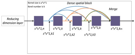 The dense spatial block learns the deeper spatial features of the HSI. For the convolution layer in the dense spatial block, the kernel size is , and the number of kernels is also . The convolution layer in the dense spatial block is termed . The output of the convolution layer of the th layer in the dense spatial block is given by
