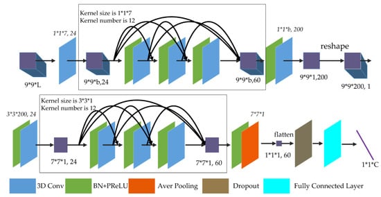 For a hyperspectral image with channels and size, r was selected as 9; that is, a target pixel served as the center of a small cube with size selected from the original pixel data as the input of the neural network. In this paper, the convolution kernel number of dense blocks was 12 and the number of convolution layers of dense blocks was 3. The FDSSC network is shown in Figure 6.