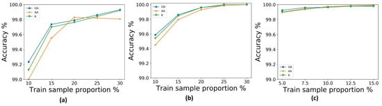 Deep learning algorithms rely greatly on the training samples. The more data used in training, the higher the test accuracy. We tried different training sample sizes on the three datasets, using 10%, 15%, 20%, 25%, and 30% on the IP and KSC datasets. For the UP dataset, the large number of data samples meant that the accuracy of the three training samples reached 99.97% with a training sample size of only 15%. Thus, we chose to test with sample sizes of 5%, 7.5%, 10%, 12.5%, and 15%. Figure 9a shows that, as the training sample size increased on the IN dataset, the OA and AA also increased, but the kappa coefficient decreased after 20%. As shown in Figure 9b, after the 20% training sample size with the KSC dataset, the OA, AA, and kappa coefficient reached 99.9%, and when the training sample size increased to 30%, all three reached 100%. As shown in Figure 9c, for the UP dataset, the OA, AA, and kappa coefficent reached 99.9% at a 10% training sample size. At a 15% training sample size, all three datasets achieved 0.01–0.02% higher accuracy than at 10%. Therefore, for the FDSSC framework, although larger training sample sizes improve accuracy to a degree, accuracy was over 99.9% for the KSC dataset with only a 20% training sample size, with the same accuracy for the UP dataset at only 10%. Even substantial increases in training time brought only very limited increases in accuracy. Therefore, we chose a training sample size of 20% for the IN and KSC datasets and 10% for the UP dataset; for all of the HSI datasets the validation dataset size was half the training dataset size and the remainder comprised the test dataset.