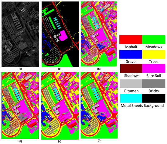 Classification maps for UP dataset: (a) real image of one band in UP dataset; (b) ground-truth map; (c) SAE-LR, OA = 98.46%; (d) CNN, OA = 99.38%; (e) SSRN, OA = 99.93%; and (f) FDSSC, OA = 99.96%.