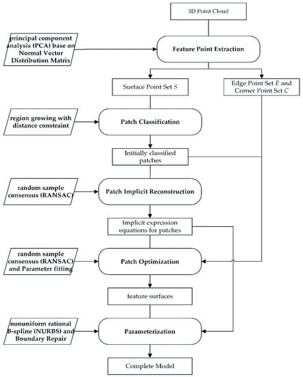 The proposed method uses PCA based on the normal vector distribution matrix to classify feature points as surface, edge, or corner points. For the set of surface points, the region growing method with a distance constraint is applied to obtain divided patches. These patches can be classified as regular quadratic, complex, and free-form surfaces according to their shape. In this study, we apply implicit and parametric surface models to reconstruct the feature surface. First, the RANSAC algorithm is used to analyze the implicit expression on patches, and the remaining edge and corner points that are not classified are substituted into the implicit expression to expand the patches. Second, the patches that fail to find a surface are expanded based on the distance constraint in the unclassified point space. Finally, the discrete point set of completely expanded patches is fitted using NURBS. The flowchart of the proposed method, called multistep segmentation and optimization (MSSO), is shown in Figure 1.