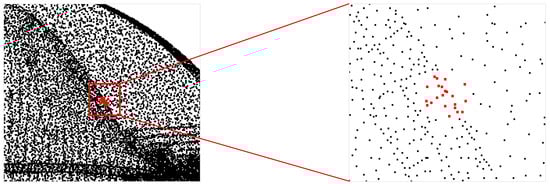 The distribution features of discrete points can be obtained by analyzing the local neighboring point coordinates via PCA. Point misclassification occurs when the distribution of discrete points is inconsistent with the actual topology relation of the surface. The red dots in Figure 2 illustrate the K nearest neighbors [40] of a point on the edge. The neighboring points are arranged in a planar shape, indicating that the points are incorrectly divided into the surface feature using PCA [19].