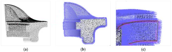 The original 3D point cloud contains point coordinates but lacks topological connection information between points. A point normal vector reflects spatial characteristics in a local surface area. Therefore, the neighboring relation between normal vectors should be obtained before other procedures. The fandisk model’s original point cloud is shown in Figure 3a, and its normal vectors are calculated with the local plane fitting method [41]. The local neighbors of each point can be approximately regarded as a plane due to the large number of points in the point cloud model [42]. For discrete point p in the point cloud, its K nearest neighbors set Q = {q1, q2, …, qK} is searched, and Equation (1) is used to calculate the plane: