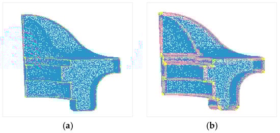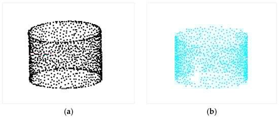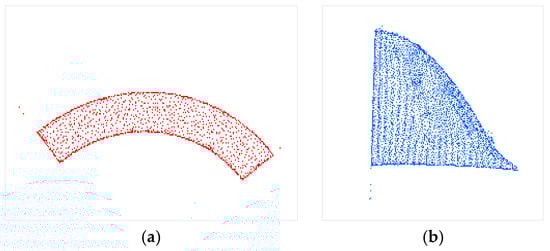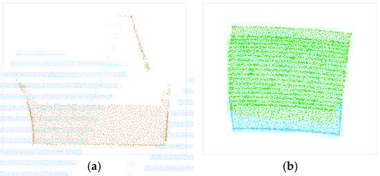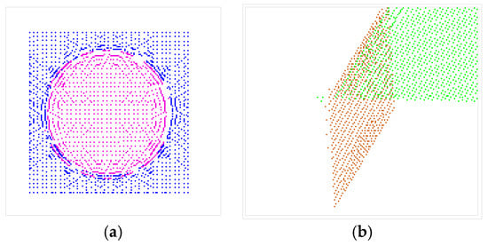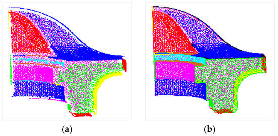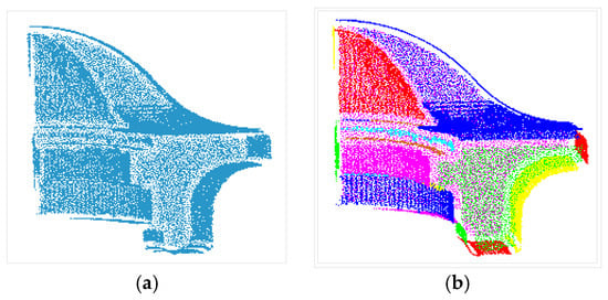 The points in set S with an equal flag fc are on the same patch. The points are stored based on their category, and each element of S = {S1, S2,… Sn} is a category. The original point display is shown in Figure 6a, and the classification display is presented in Figure 6b, where point sets with different colors represent different patches.