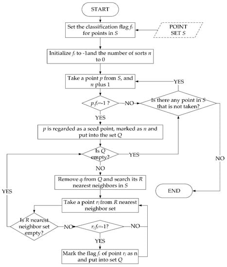 - The algorithm is terminated when all the points in point set S are extracted. Otherwise, n is incremented, and a point p is extracted from point set S to determine whether its classification flag fc is −1 one by one. fc is regarded as a seed point, marked as n, and stored in the temporary point set Q when its value is −1. If fc is not −1, another point is obtained from S.