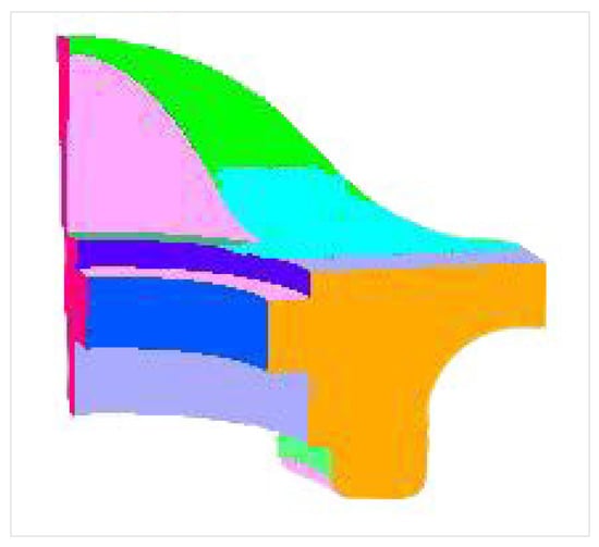 After completing the feature surface extraction of the point cloud model, each surface is represented via parameter expression to facilitate the display and reuse of each platform. This study uses the NURBS module packaged in Point Cloud Library [43] to program NURBS fitting on the Visual Studio platform. Considering the effect and speed of the algorithm, the NURBS polynomial order is set to the experimental value 3, and the number of vertices in each parameter direction is set to the experimental value 100. Then, each feature surface is automatically fitted, and the fitting result based on the fandisk model is shown in Figure 9.