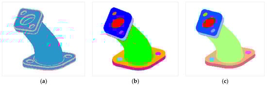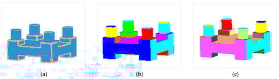 The result of feature point segmentation for the fandisk model is shown in Figure 11a, the feature surface extraction is shown in Figure 11b, and the feature surface reconstruction is shown in Figure 11c. The experimental results from the support frame and connecting piece models are shown in Figure 12 and Figure 13, respectively.