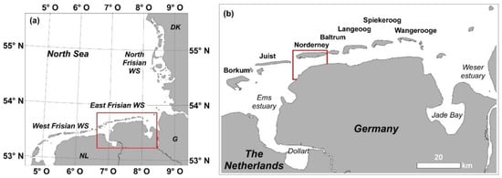 The study area in the German Wadden Sea: (a) the Trilateral Wadden Sea in the German Bight; (b) the main investigation area located at Norderney in the East Frisian Wadden Sea.