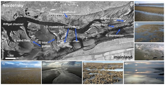 Tidal flat areas off shallow coasts can be found worldwide. The world’s largest coherent intertidal area, the Wadden Sea, is stretching for over 500 km along the North Sea coast of The Netherlands, Germany, and Denmark with a width of up to 20 km. The system of barrier islands, intertidal flats and sandbanks, channels, gullies, and salt marshes forms the transition between the mainland and the open North Sea. The Wadden Sea is one of the last large-scale and near-natural ecosystems in Central Europe, whose ecological functions are supraregional and of far-reaching importance, e.g., as an indispensable stepping stone for birds migrating on the East Atlantic Flyway. In addition, it also plays an important role in coastal protection. The Wadden Sea is protected by a high national as well as international conservation status and it is listed as UNESCO world heritage site. Regular monitoring of the area is mandatory but complex and expensive because of the large area of rough terrain which is accessible only in tight timeframes due to the changing tides. Therefore, remote sensing techniques are required and aerial mapping and photography (e.g., mussel beds, seagrass meadows, salt marsh vegetation) as well as airborne lidar (light detection and ranging) provide the high resolution needed to determine surface structures of the tidal flats or salt marsh vegetation types. Today they are applied in operational monitoring programs of the Wadden Sea. Aerial photographs have been used in the Lower Saxony Wadden Sea since the 1990s for the monitoring of mussel beds [,,] and for biotope mapping of the salt marshes [,,]. Aerial photography and lidar are also used by the responsible authorities for coastal protection (NLWKN, unpublished data). A possible support of the seagrass mappings by aerial photographs was examined by Ref. [].
