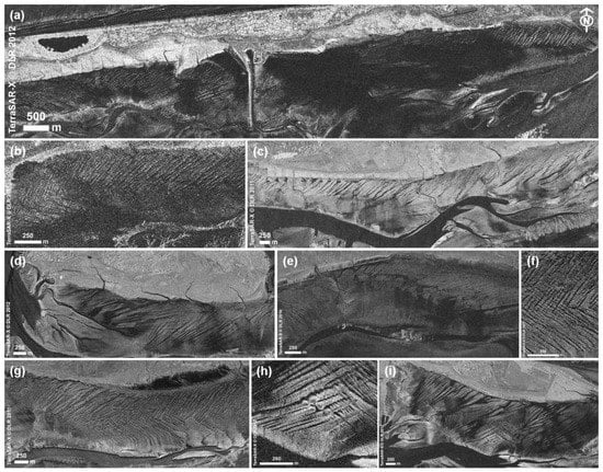 As an example, the appearance of tidal channels, creeks, and gullies reproduced in SAR images is heavily dependent on water level as soon as the water reaches the tideway’s edges or goes beyond. Therefore, changes in water level due to weather conditions or even wind-drift may have an effect especially on the gently rising slip-off slopes in contrast to the steep edges of the eroding banks, whose positions will not be markedly affected even for larger variations of the water levels. Thus, to observe and compare the courses of channels and gullies, they should on the one hand be imaged close to maximum drained stage, and on the other hand the steep eroding banks should be used as markers. The same applies when determining migration rates for bedforms in the upper island flats, whose slopes have been found to be slightly asymmetrical []. Conversely, in the case of multi-temporal acquisitions, the magnitude of changes in the water level lines would indicate the slope inclination.