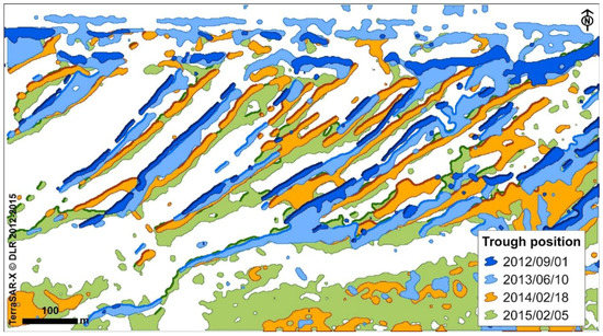 The results of the survey are described in detail by Ref. [], who demonstrate that visual trough detection as well as results from unsupervised ISODATA classification of textural parameters from TerraSAR-X data are in good accordance with the in situ measurements of the bedforms. Spatio-temporal GIS-analysis of trough positions extracted from a time-series of TerraSAR-X images then revealed a shifting of the bedforms in an easterly direction during the study period from 2009–2015. This general bedform shift is demonstrated for the years 2012–2015 in Figure 7. The western trough edges are highlighted because in situ measurements as well as TerraSAR-X data reproducing variable states of water-cover indicate an asymmetry of the bedforms leading to steeper western trough edges and smoother eastern edges. Therefore the waterlines of the western edges proved to be a better indicator for the trough positions even with a slightly varying amount of residual water on the exposed flats due to environmental conditions or tidal state.