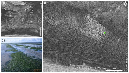 Southeast of the island of Wangerooge, as an example, in the near-shore area close to the mainland, linear surface structures were detected on a TerraSAR-X image from 2012 and verified in situ. A field of common cockle (Cerastoderma edule) apparently stabilized the linear structures and made them both more durable and more conspicuous in the TerraSAR-X data. Additionally, the elevated ridges of the sediment and cockle surface were covered by green algae, which contributed to the clear picture (Figure 8). In situ observations in 2016 have shown that in the meantime, the cockle field had been occupied by blue mussels (Mytilus edulis) and turned into a patchy mussel bed.