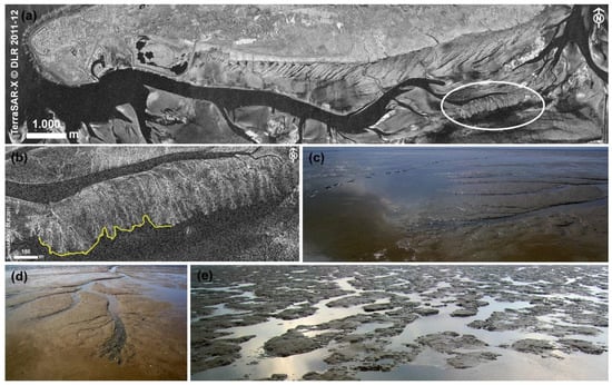 Large mud field in the tidal area of Norderney: (a) location of the mud field close to the watershed, marked by oval line (HRS of 02/06/2011, asc.); (b) GPS measurement of mud field’s edge taken on 27/07/2011 (yellow line) compared to TerraSAR-X HRS of 16/07/2011, asc.; (c) photography along the mud field’s edge (27/07/2011); (d) gully delta at the mud field’s edge (27/07/2011); (e) humpy mud field surface with water puddles (27/07/2011).