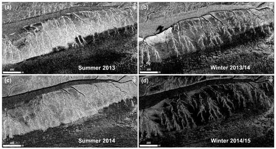 In fact, regarding the mud field over several years (2011–2015) in the TerraSAR-X data, seasonal changes are observed. During summer, the mud field surface is displayed in full width with high backscatter, in winter, however, the area of high backscattering retreats towards the Riffgat channel. The internal gully structures, on the other hand, remain visible throughout the year, across the entire width from channel to depression. This can be seen in Figure 10a–d showing the reproduction of the mud field in TerraSAR-X acquisitions from summer 2013, the following winter (02/2014) and the next summer (06/14) and winter (12/2014).