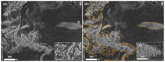 By means of visual analysis, the channels are clearly visible in the TerraSAR-X data (Figure 4b,c). However, Figure 4b also illustrates how automatic channel detection may be difficult due to the varying representation of the water surface and to internal patterns e.g., depending on the presence of surface-active agents, weather, or flow conditions at the time of acquisition.