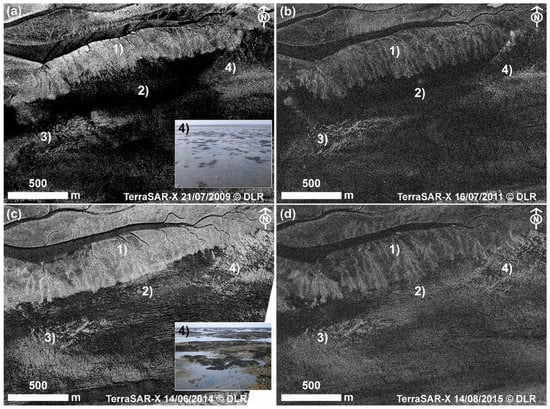 Time series 2009–2015 of tidal area imaged by TerraSAR-X, HRS: (a) 21/07/2009, asc., 111 cm < NHN and photograph of 14/07/2008; (b) 16/07/2011, asc., 152 cm < NHN; (c) 14/06/2014, desc., 132 cm < NHN and photograph of 17/10/2014; (d) 19/04/2015, desc., 166 cm < NHN. (1) mud flat; (2) depression; (3) area of patchy mussel bed; (4) area of solid mussel bed.