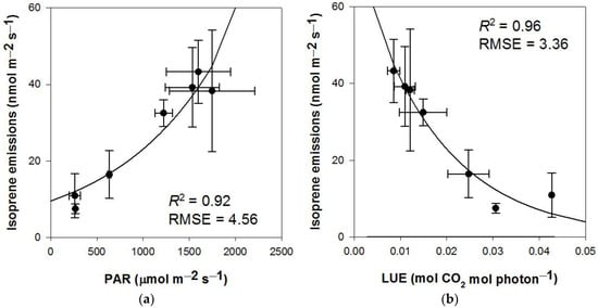 Results of exponential correlation (y = a × ebx) between foliar isoprene emissions and (a) photosynthetically active radiation (PAR); (b) light use efficiency (LUE). R2 = coefficient of determination; RMSE = root mean square error.