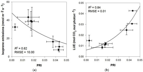 Results of exponential correlation (y = a × ebx) between (a) foliar isoprene emissions and photochemical reflectance index (PRI); (b) LUE and PRI.